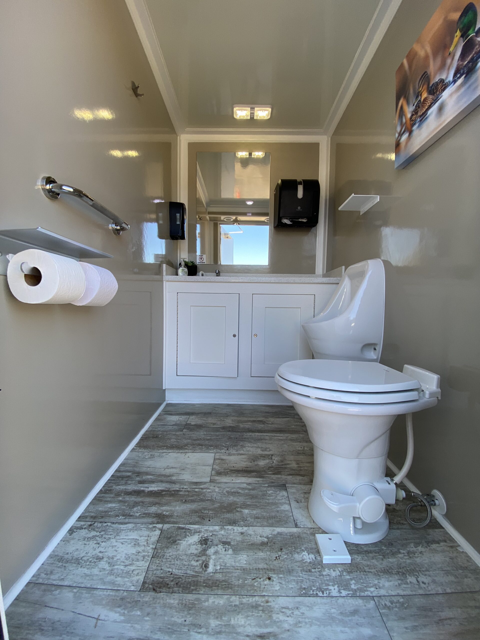 Introducing our deluxe 3-station restroom trailer, designed to elevate comfort and convenience at any event or venue. This spacious floor plan has (2) private women’s suites and (1) private men’s suite with a urinal and a toilet. Your guests will find a well-appointed vanity, complete with a shatterproof mirror, alongside a pedal flush china toilet. The men’s suite mirrors the amenities of the women’s, with the addition of a convenient urinal for extra convenience.