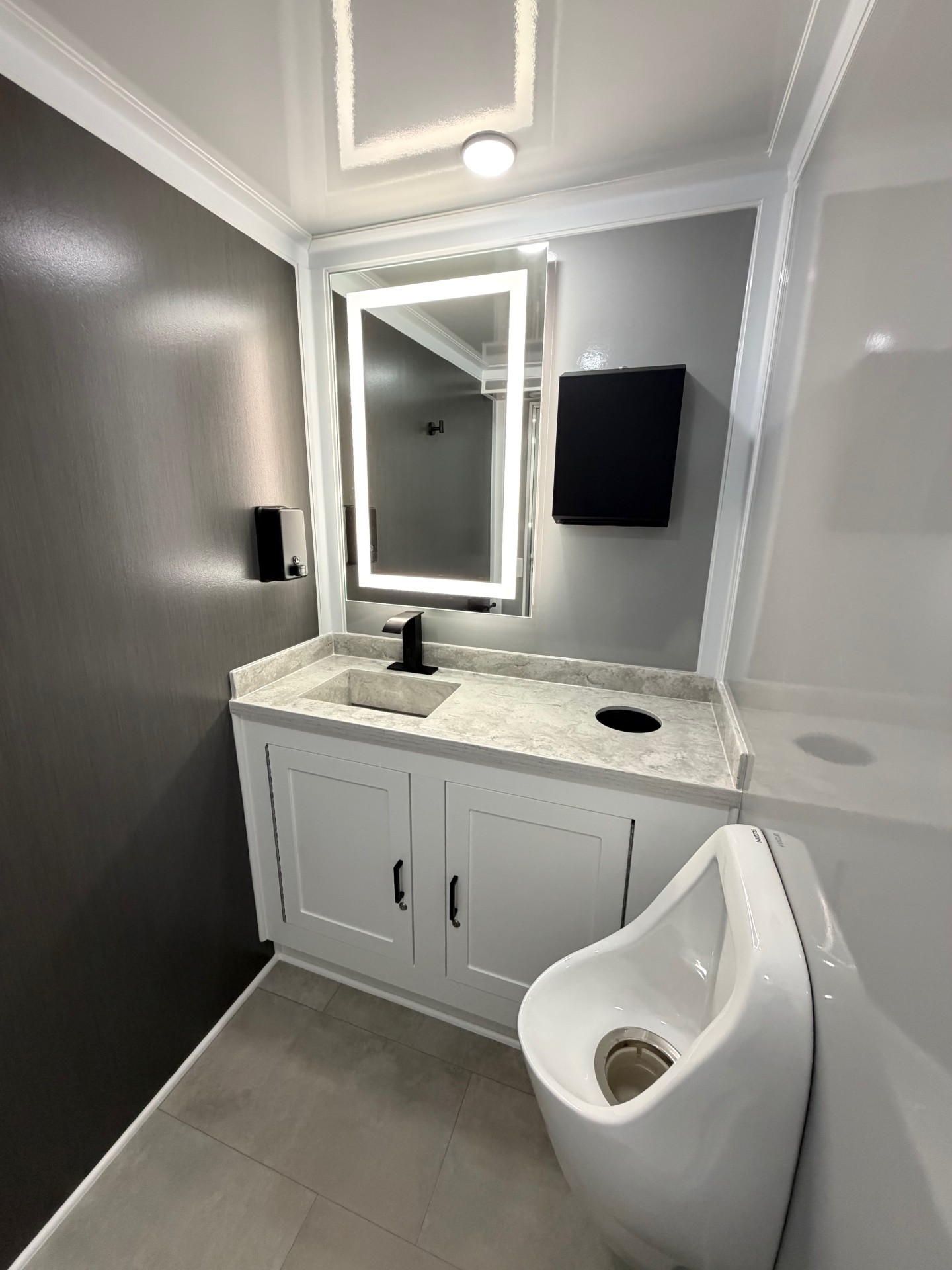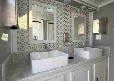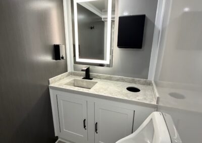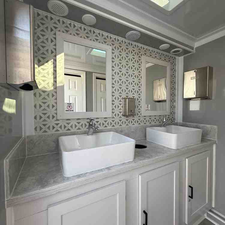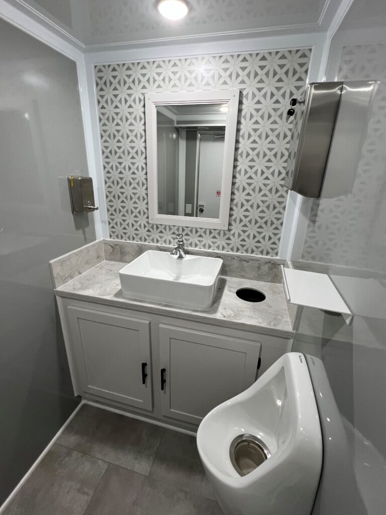 I saw one of these when I went to a friend’s wedding. This is not the typical portable potty. Inside the restroom, you will find it very clean and spacious. Large mirror with matching countertop, and nicely decorated.